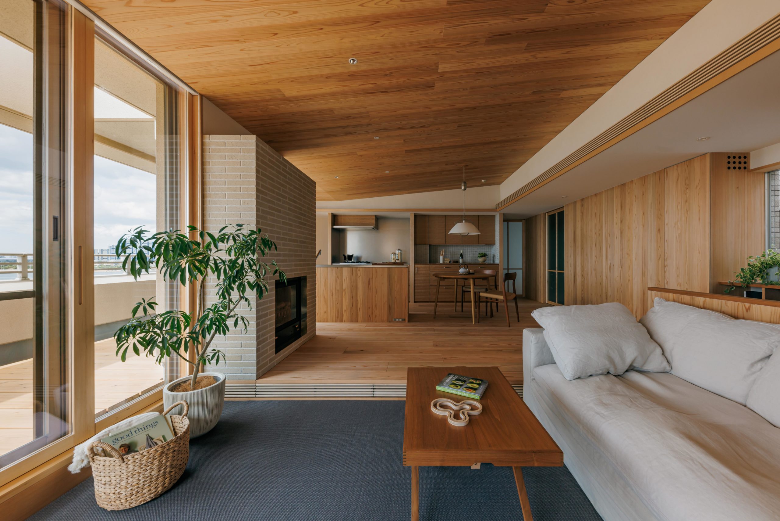 寝室廊下の先にキッチンとリビング。大きな窓際には街を一望できる眺望が癒しのスペースとなるヌックスペース。居室内には吉野杉の床板、壁板、天井や壁のアクセントに熊野桧 自然素材を惜しみなく使った家具や造作キッチン。木のマンションリノベーションで 暮らしの一部に季節の移り変わりも楽しむ事ができる空間に仕上がりました。