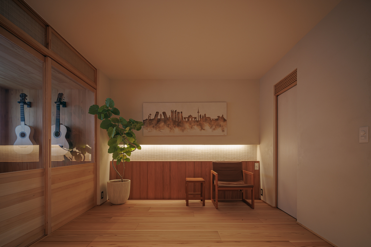 マンション上層階で陽当たりと眺望が良い角部屋のお宅を施工しました。造作材に吉野杉・吉野桧・広葉樹など国内材をふんだんに取り入れました。玄関から続く赤杉の廊下の先には明るく広々としたリビング。キッチンから洗面、サンルーム、寝室、玄関へと続く暮らしやすい回遊動線。フレキシブルな木製の可動家具でライフスタイルに合わせたプライベート空間。機能面では全室空調を取り入れ、四季を通じて快適な環境で過ごせるお住まいになりました。